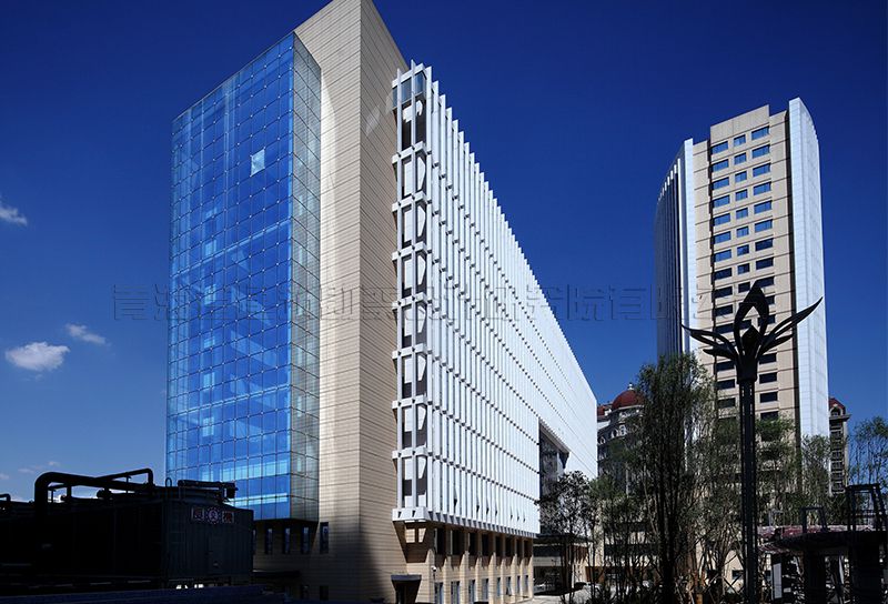 建筑體型:A區(qū)、B區(qū)一至四層為一個(gè)整體,內(nèi)部根據(jù)不同功能劃分平面。A區(qū)主樓平面呈矩形,B區(qū)主樓平面呈橄欖形,建筑立面窗采用玻璃幕墻及矩形窗的分隔方式,實(shí)體墻分為掛貼米色陶土板,立面豎向線條為鋁合金象牙白氟碳涂膜,立面設(shè)計(jì)手法現(xiàn)代、簡(jiǎn)潔、方正、大氣,達(dá)到良好的視覺效果,幕墻與實(shí)體墻比例劃分恰當(dāng),米色陶土板墻面分格細(xì)膩,具有高品質(zhì)現(xiàn)代辦公建筑的特征,成為西寧海湖新核心區(qū)有特點(diǎn)的標(biāo)志建筑。